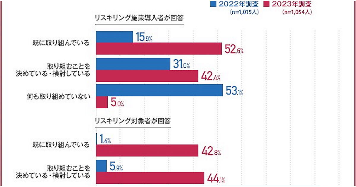 リスキリング対象者層は、2022年度調査では9割以上が「何も取り組めていない」と回答していたが、2023年度調査では1割台に減少している。