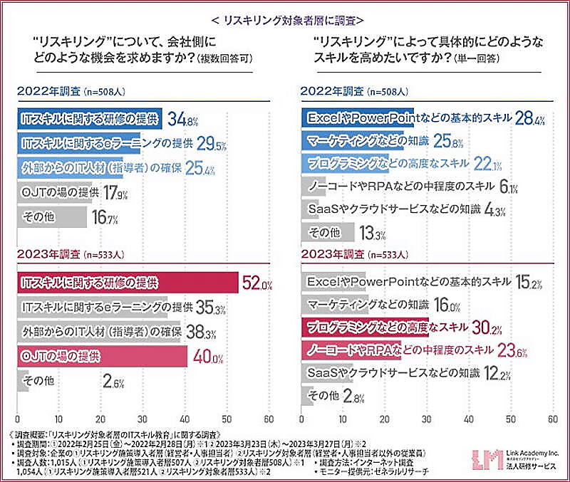 リンクアカデミーが実施した「リスキリング対象者層のITスキル教育」に関する調査によると、「リスキリング(Re-skilling)」の取り組みに力を入れている企業が増えているようだ。