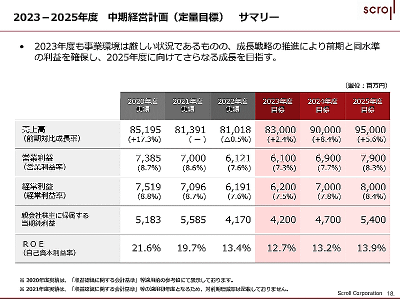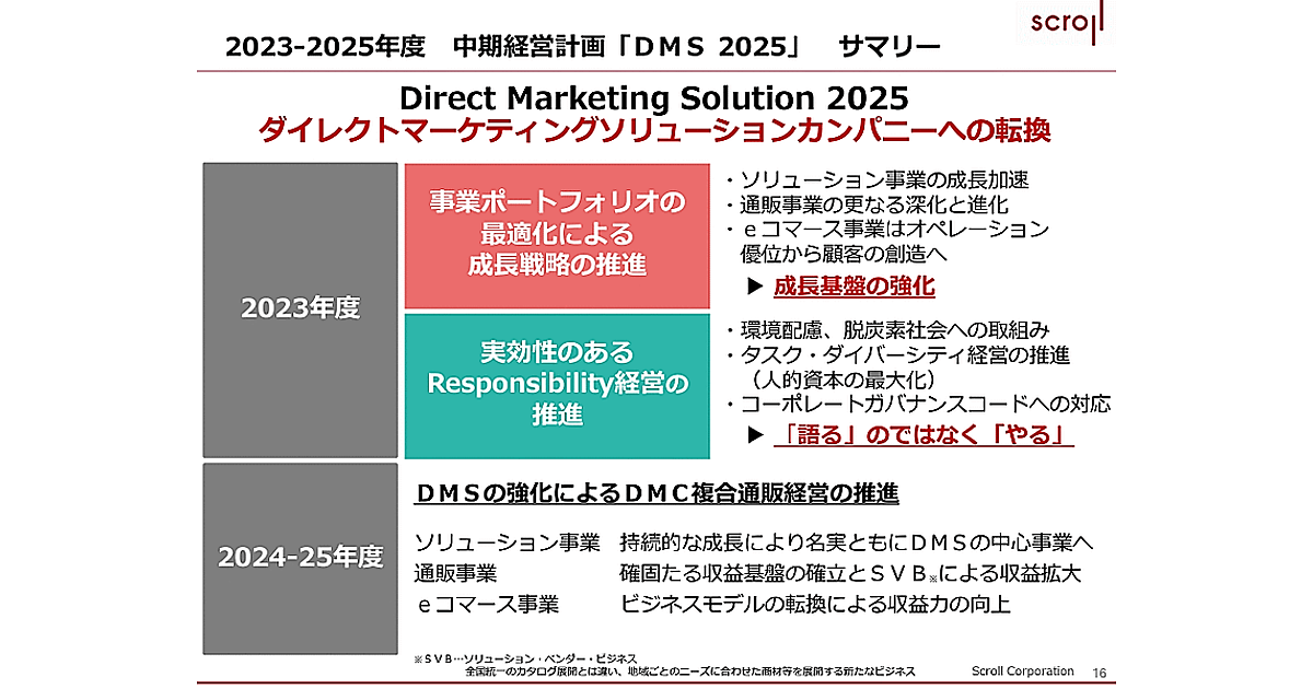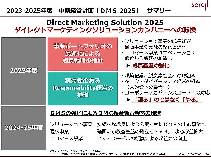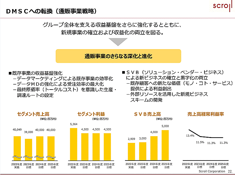 スクロールは、2023年4月から始まる3か年の中期経営計画(中計)を策定した。最終目標として、現状の「EC・通販企業」から、「ダイレクトマーケティングソリューションカンパニー(DMSC)」への転換を掲げている。