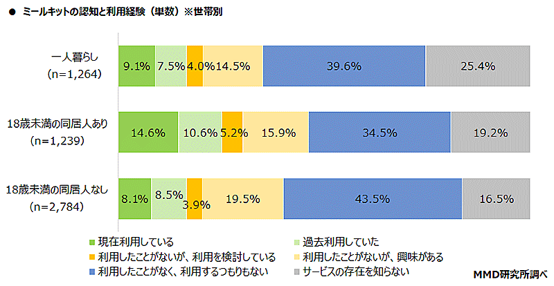 調査対象者のうち、日常生活で食材・食品を購入すると回答した人にミールキット(食材とレシピが入った料理セット)の利用経験について聞いたところ、「現在利用している」(9.9%)と「過去利用していた」(8.7%)を合わせて、18.6%が「利用経験がある」と回答した。
