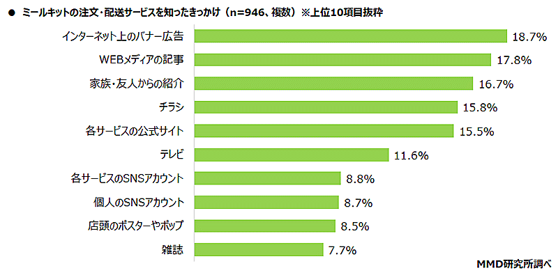 ミールキットの注文・配送サービスを知ったきっかけを聞いたところ、トップは「インターネット上のバナー広告」(18.7%)で、「Webメディアの記事」(17.8%)「家族・友人からの紹介」(16.7%)と続いた。