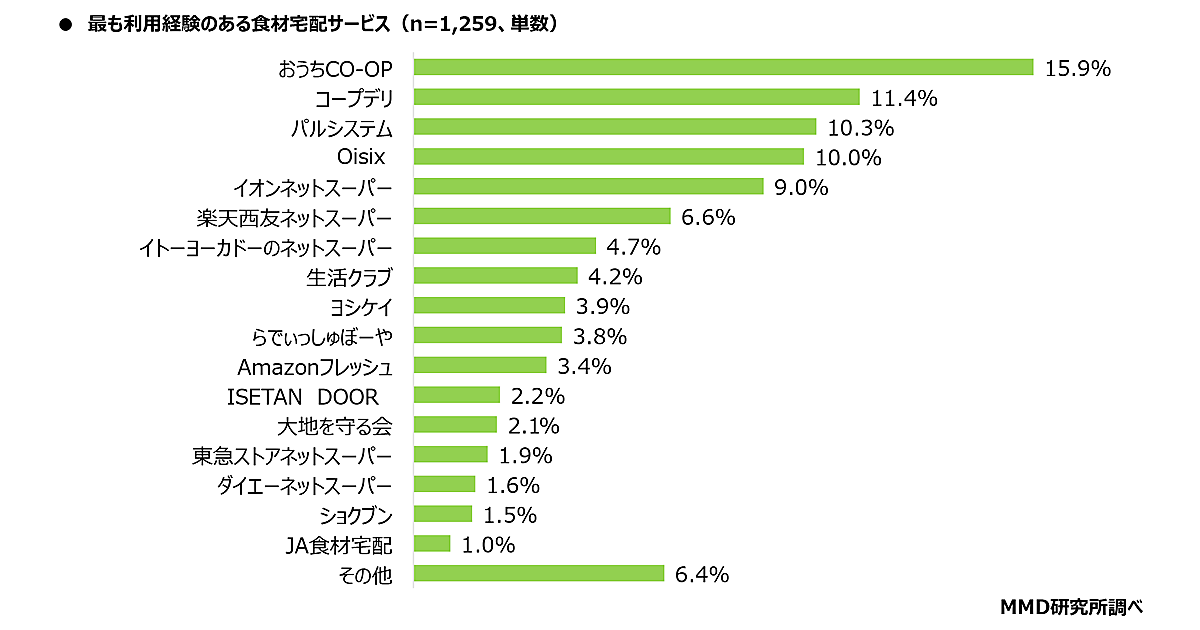 最も利用経験がある食材宅配サービスの上位は「おうちCO-OP」「コープデリ」「パルシステム」