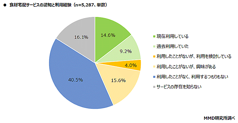 調査対象者のうち、日常生活で食材・食品を購入すると回答した人に食材宅配サービスの利用経験について聞いたところ、「現在利用している」(14.6%)と「過去利用していた」(9.2%)を合わせて、23.8%が「利用経験がある」と回答した。