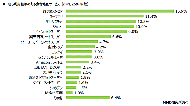 食材宅配サービスの利用経験がある人に、現在または過去最も利用経験がある食材宅配サービスを聞いたところ、最多は「おうちCO-OP」(15.9%)、次いで「コープデリ」(11.4%)「パルシステム」(10.3%)だった。