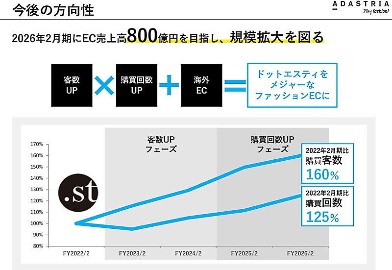 同社は30以上の自社ブランドを取り扱う自社通販サイト「ドットエスティ」が好調だが、今年1月に不正アクセスを受けて自社ECも8日間休止したものの、前期はプロモーションの強化や商材の拡大などで自社ECが継続成長したほか、子供服のEC専業をグループ化したこともEC売り上げを押し上げた。