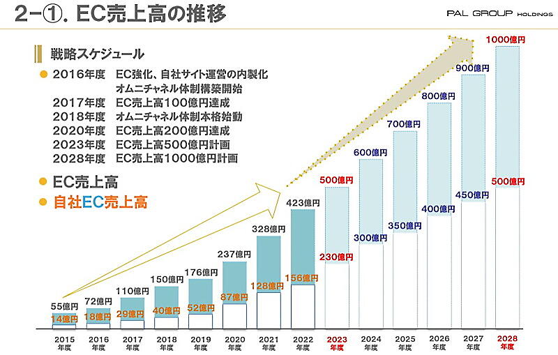 パルのEC売上高は前年比28.7%増の約423億円とコロナ3年目も高成長を維持。計画の400億円を大きく上振れした。