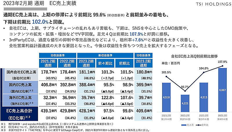 前期のEC事業は上期に停滞したものの、下期は前年同期比2.0%増と回復した。自社ECは上期にサプライチェーンの乱れもあって苦戦。下期はSNSを軸にしたOMO施策や、コンテンツの拡充などでV字回復した。とくに直近の12~2月は7.9%増で、今期に入っても好調を維持しているという。