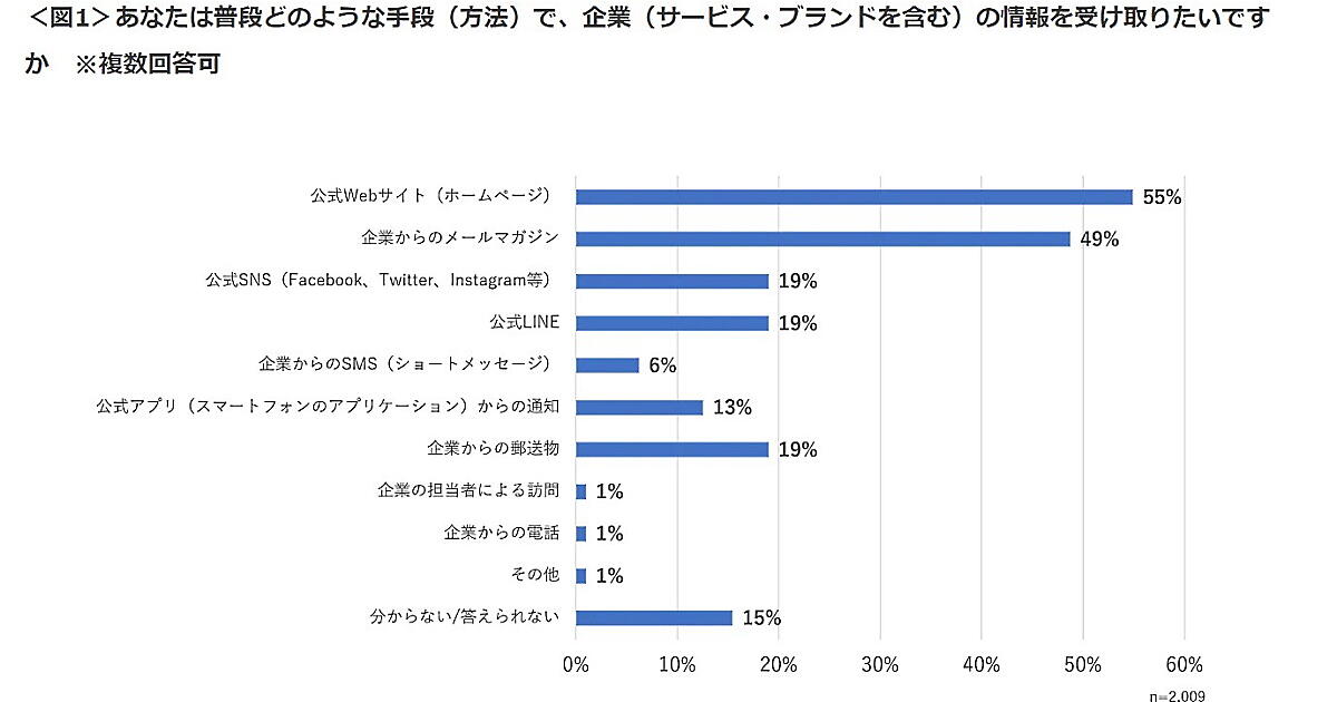 - 企業からの情報を受け取る手段は「公式Webサイト」(55%)、「メールマガジン」(49%)が多数。20代は「公式SNS」を積極的に活用