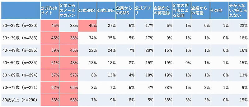 年齢別で見ると、20代では「公式Webサイト(ホームページ)」「公式SNS(Facebook、Twitter、Instagramなど)」、30代以上は「公式Webサイト」「企業からのメールマガジン」が上位を占めた。