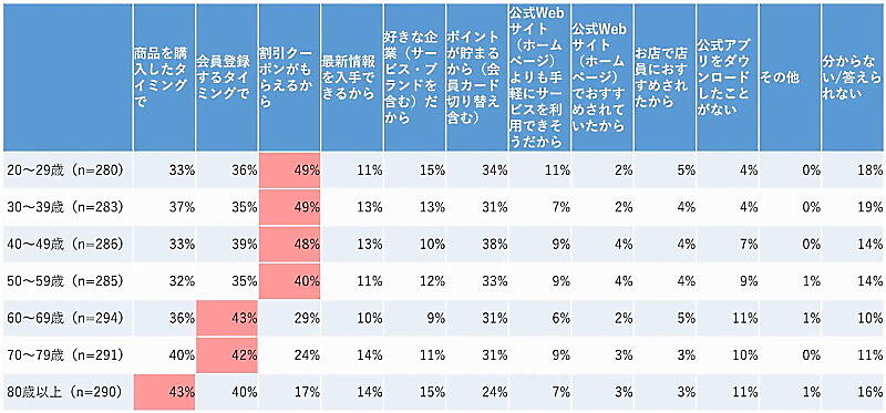 年齢別で見ると、20~50代は「割引クーポンがもらえるから」、60代以上は「会員登録するタイミングで」「商品を購入したタイミングで」が上位を占めた。「公式アプリをダウンロードしたことがない」を選択したのは50代以下で10%未満、60代以上は10%前後にとどまった。