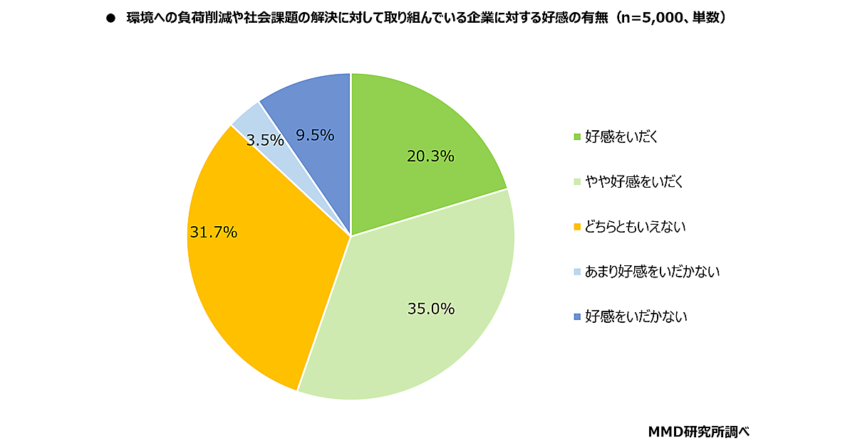 MMDLaboが運営するMMD研究所が発表した「企業の環境・社会問題への取り組み及び端末の再生品・中古品に対する意識調査」によると、企業の環境への負荷軽減、社会課題に関する取り組みに「好感を抱く」と回答した割合は55.3%だった。調査対象は15歳~69歳の男女5000人。期間は2023年4月17日~4月19日。