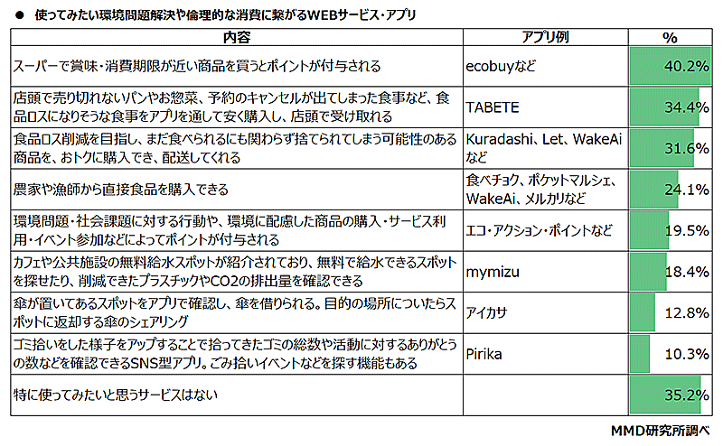 環境問題解決や倫理的な消費につながるWebサービス・アプリの説明を行い、アプリ名を例にあげて使ってみたいサービスを聞いたところ、利用が最も高かったのは「スーパーで賞味・消費期限が近い商品を買うとポイントが付与されるサービス(例:ecobuyなど)」(40.2%)。次いで、「店頭で売り切れないパンやお惣菜、予約のキャンセルが出てしまった食事など、食品ロスになりそうな食事をアプリを通して安く購入し、店頭で受け取れるサービス(例:TABETE)」(34.4%)「食品ロス削減をめざし、まだ食べられるにも関わらず捨てられてしまう可能性のある商品を、おトクに購入でき配送してくれるサービス(例:Kuradashiなど)」(31.6%)だった。