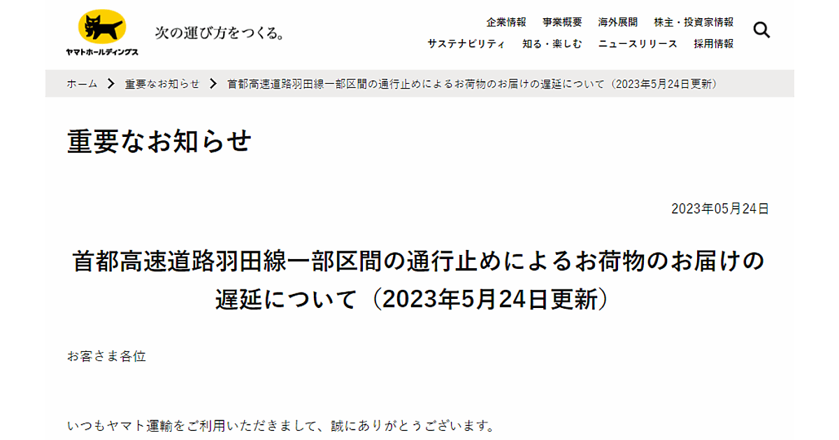 ヤマト運輸は5月27日から6月10日の期間、首都高速道路と周辺一般道において交通渋滞が予測されるため、一部地域への荷物の配送に遅れが生じる可能性があると発表した。