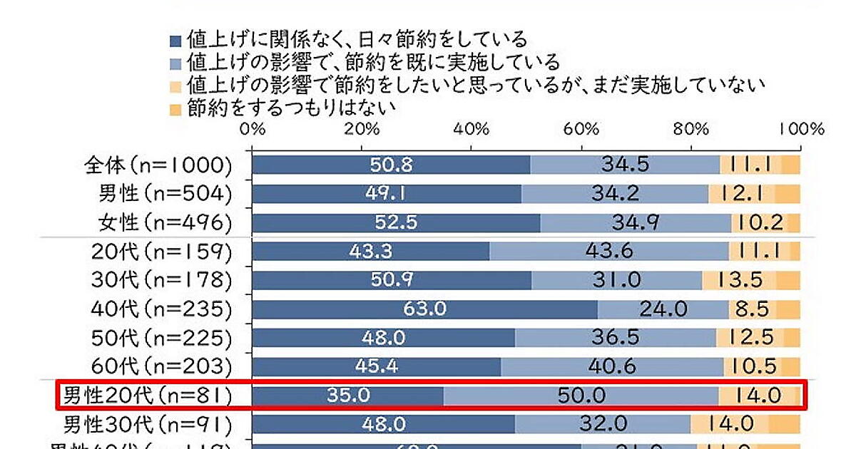 物価高騰に対する行動・気持ちについて、「値上げの影響で、節約をすでに実施している」は全体の35%を占め、なかでも男性の20代ではその傾向が多く見られた。また、「値上げに関係なく、日々節約をしている」は全体の半数に達している。