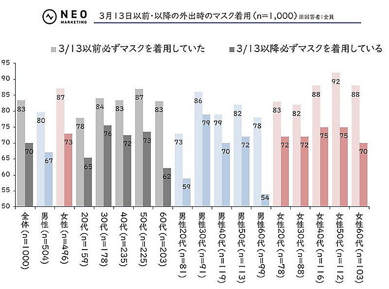 2023年3月13日に、マスクの着用は原則、個人の自由となった。3月13日より以前に比べて、3月13日以降のマスク着用者は全体で10ポイント程度減るものの、多くの人がマスク着用を継続している。年代別で見ると、男性の60代が最もマスク着用をやめる割合が多い。この年代がマスクへの抵抗感が最も強かった年代だったと推察される。