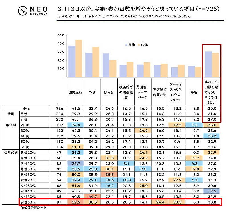 3月13日以降の外出で「外出することをためらわない」または「外出することをあまりためらわない」と回答した人に対し、「3月13日以降実施する回数を増やそうと思う項目」を調査したところ、60代女性を筆頭に国内旅行や外食を増やそうというマインドの人がいるものの、全体の3割程度は何かを増やす気持ちがないようだ。ネオマーケティングは「昨今の物価上昇などが影響し、財布のひもがきつくなっていることが要因となっている可能性がある」と指摘している。