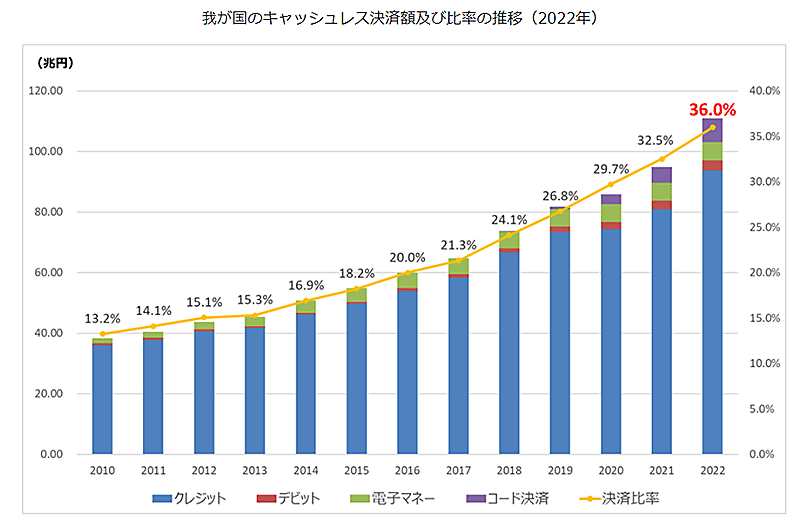日本のキャッシュレス決済比率は年々上昇しているものの、2022年で36.0%と諸外国に比べて低い。日本政府は2025年までに4割程度、将来的には80%をめざしてキャッシュレス決済を推進している。