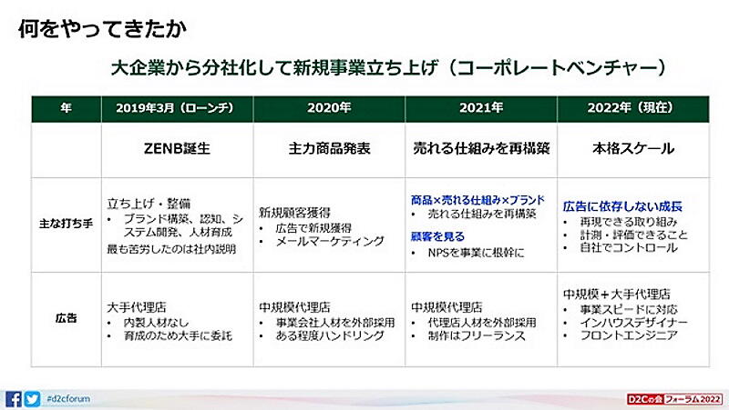 立ち上げ当初、社内説明など大企業から分社化したコーポレートベンチャーならではの苦労があった。転換となったのは2021年の「売れる仕組み」の再構築。本サイト(ショップ)からカートに誘導するのではなく、LP主体・定期主体での販売に切り替えたことだ。その再構築が功を奏し、定期が売り上げの9割を占めている。