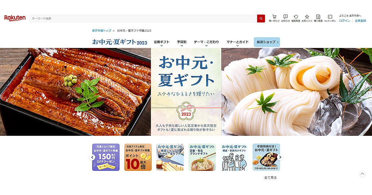 楽天グループは、「楽天市場」に特集ページ「楽天市場 お中元・夏ギフト特集2023」を6月1日に公開した。