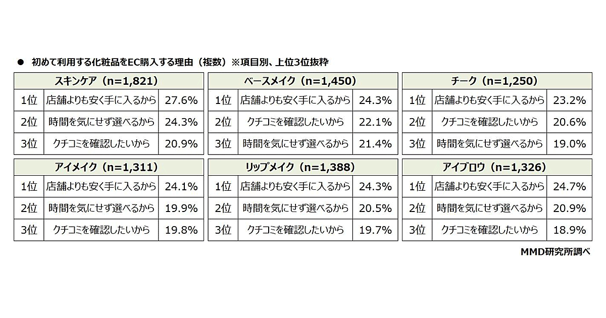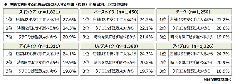 初めて使う化粧品のEC購入、「スキンケア」が54.4%