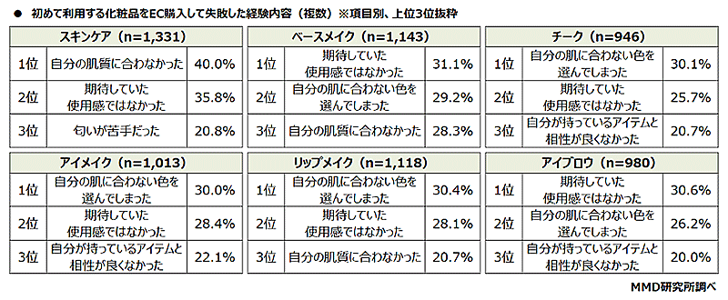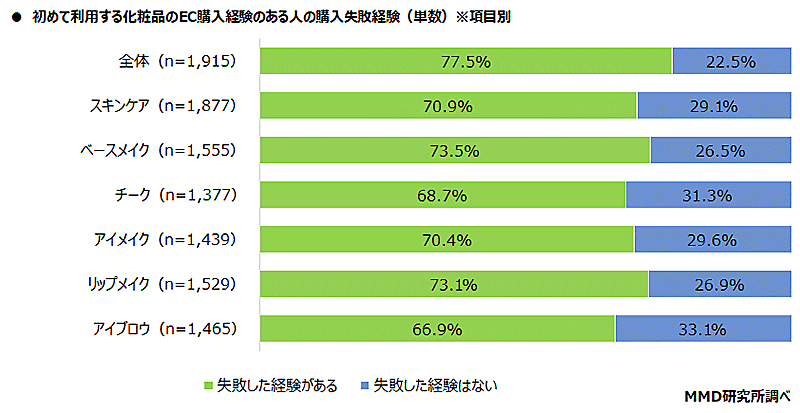 初めて使う化粧品をECで購入経験がある人の77.5%が失敗経験あり