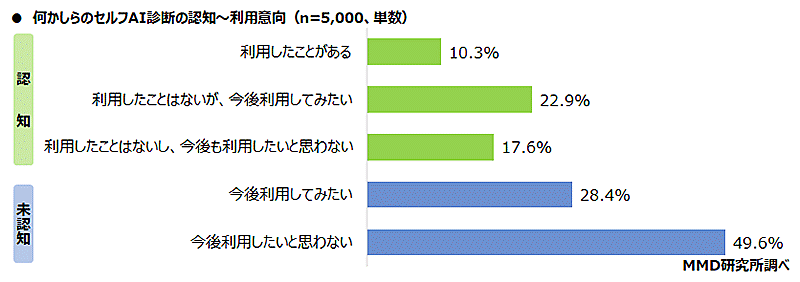 調査対象者にセルフAI診断の認知、利用意向について聞いたところ、認知は50.8%、「利用したことがある」は10.3%だった。