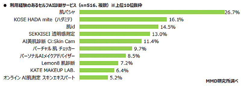 セルフAI診断サービスを「利用したことがある」と回答した人に、利用経験のあるセルフAI診断サービスを聞いたところ、トップは「肌パシャ」(26.7%)、次いで「KOSE HADA mite(ハダミテ)」(16.1%)「肌id」(14.5%)だった。