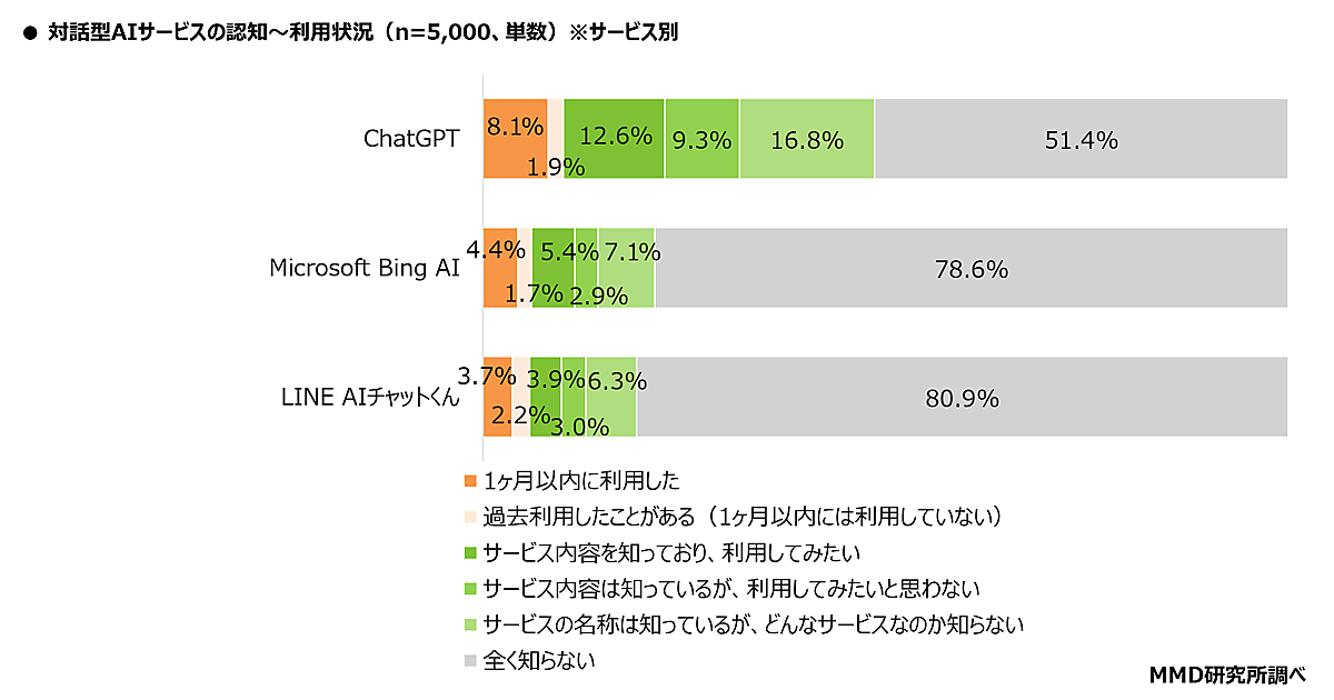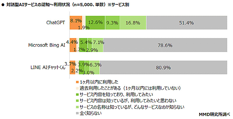 MMDLaboが運営するMMD研究所が発表した「ChatGPTに関する調査」によると、「ChatGPT」の利用経験は10.0%だった。調査対象は15歳~69歳の男女5000人。期間は2023年5月8日~5月10日。