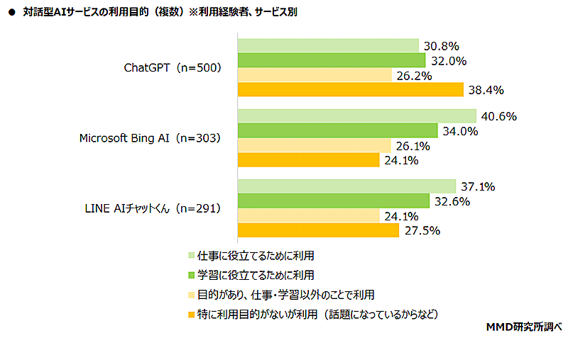 対話型AIサービスを「利用したことがある」と回答した人に、サービスを利用する目的を聞いたところ、「仕事に役立てるために利用」と回答したのは「ChatGPT」が30.8%、「Microsoft Bing AI」が40.6%、「LINE AIチャットくん」が37.1%だった。