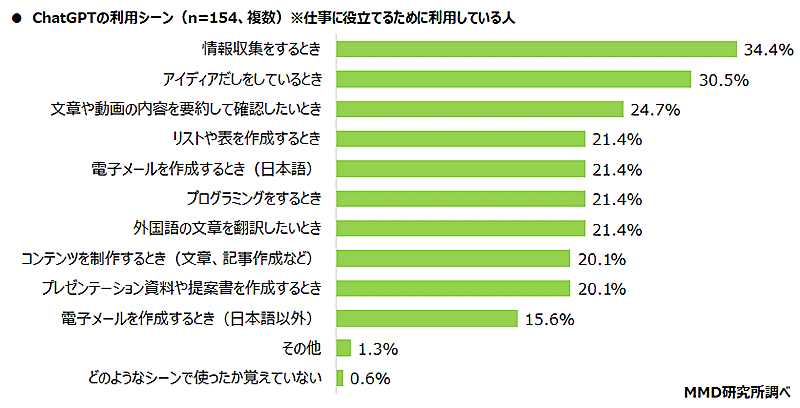 仕事での「ChatGPT」利用シーン、上位は「情報収集」「アイディア出し」「文章・動画の要約」