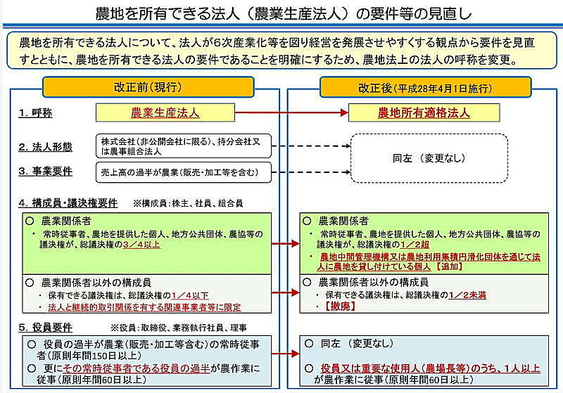 国内での高齢化や担い手不足による離農の進行を食い止めるため、2009年に実施された農地法の改正では、農業への参入規制が緩和。また、2015年の同法の改正では、農地を所有できる法人の要件が見直された。