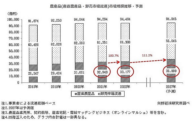 矢野経済研究所は、産直農産品は2027年には、2022年比111.2%の3兆6900億円になると予測。卸売市場を含む農産品市場規模全体は2022年比100.5%の9兆4945億円を予測している。