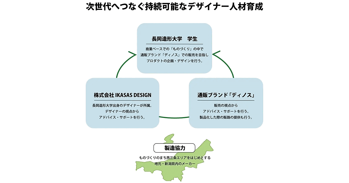 今回の産学連携は、IKASAS DESIGN所属のデザイナーが長岡造形大学出身ということがきっかけで始動した。長岡造形大学では、学生が授業でプロダクトデザインを学べるものの、在学中に実社会で実装する機会は少なく、商業ベースのデザインとのギャップがあることが課題の1つだった。