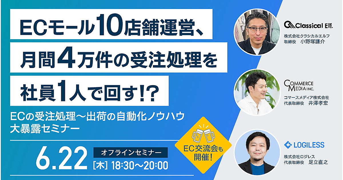 コマースメディアとロジレスは6月22日(木)、EC通販事業者向けに「ECモール10店舗運営、月間4万件の受注処理を社員1人で回す!? ECの受注処理~出荷の自動化ノウハウ 大暴露セミナー」をオフラインで開催する。