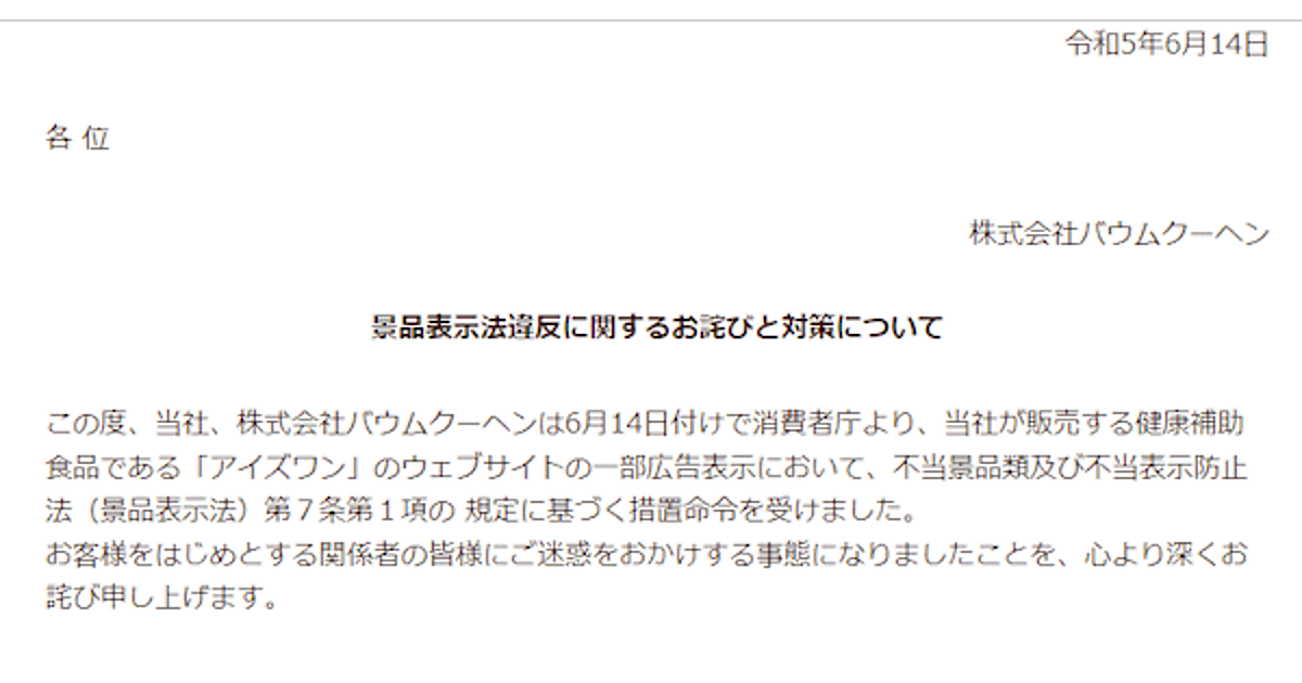 販売する健康補助食品である「アイズワン」のウェブサイトの一部広告表示において、お客さまをはじめとする関係者の皆様にご迷惑をおかけする事態になりましたことを、心より深くお詫び申し上げます。今後は本件を真摯に受け止め、再発防止に向けて景品表示法など関係する法令についての教育を徹底するとともに、広告などのガイドラインの見直しおよびチェック・管理体制の強化を行ってまいります。