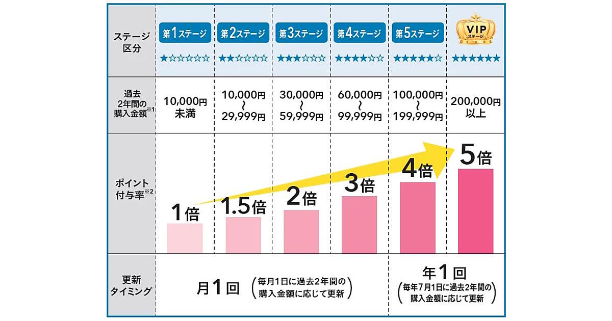 また、上位の第5ステージ・VIPステージでは、ステージ更新を月1回から年1回へ変更。上位のステージを維持しやすくする。
