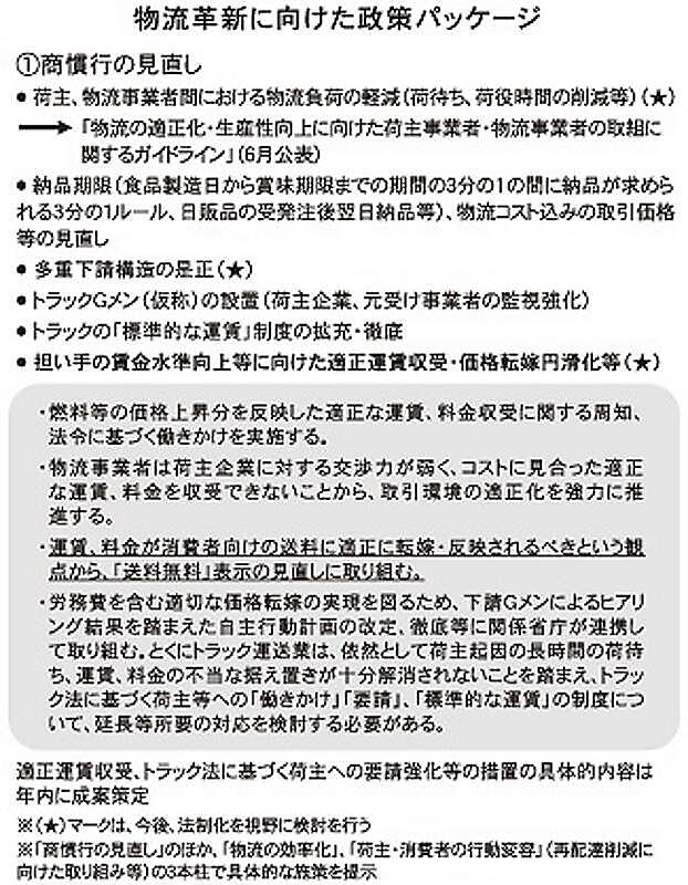 前出担当者は、政策パッケージの内容を「商習慣の見直しは業界だけではどうにもならない。国の後押しはありがたい」と歓迎する。「送料無料」表示には、「そもそも送料は、運送の対価として受け取るもの。現場のドライバーの苦労もある。表示することで物流が軽く見られる。消費者にそういった意識を植え付けてほしくない。荷主事業者、消費者に理解を求めたい」と話す。