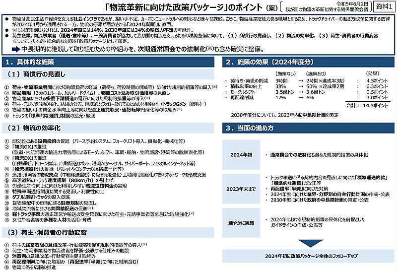 政府は政策パッケージの実現に向け、一部は次期通常国会への法案提出で法整備を進める。「商慣行の見直し」のうち、荷主、物流事業者間の物流負荷の軽減に向けた荷待ち、荷役時間の削減は、先行してガイドラインを示した。