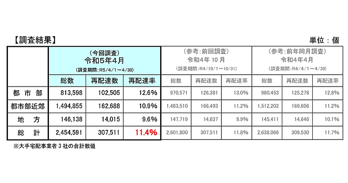 国交省の調査によると、2023年4月の宅配便総個数は245万4591万個。そのうち再配達数は30万7511個で、再配達率は11.4%だった。都市部の再配達率は12.6%、都市近郊部で10.9%、地方で9.6%。