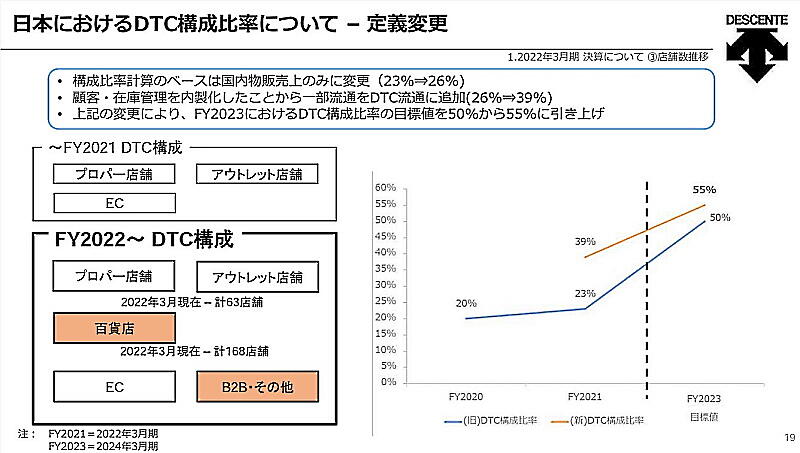 デサントグループは、2021~2023年度(2024年3月期まで)の中期経営計画「D-Summit 2023」における戦略の1つに、国内のDTC事業の強化を主とする商品企画と流通改革を掲げ、2024年3月期に国内売上のうち55%をDTC事業が占めることをめざしている。