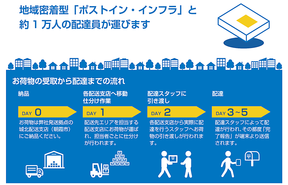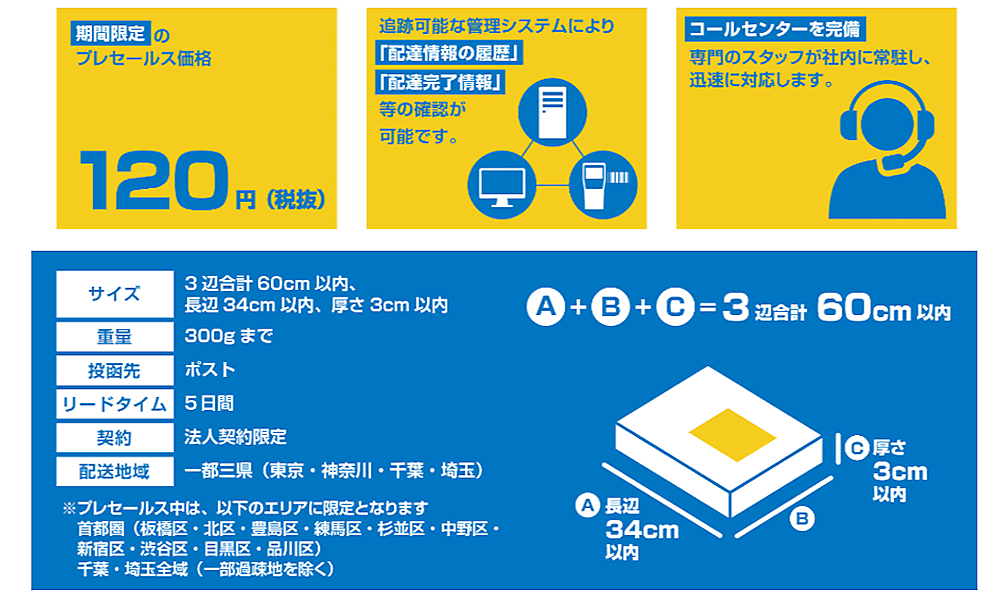 「ポスト投函できる小荷物」は、3辺合計が60cm以内、長辺34cm以内、厚さ3cm以内。重量は300gまで。リードタイムは5日間。「コニポス」を利用する企業は、地区宅便の発送拠点である城北配送支店(埼玉県朝霞市)に荷物を納品する必要がある。