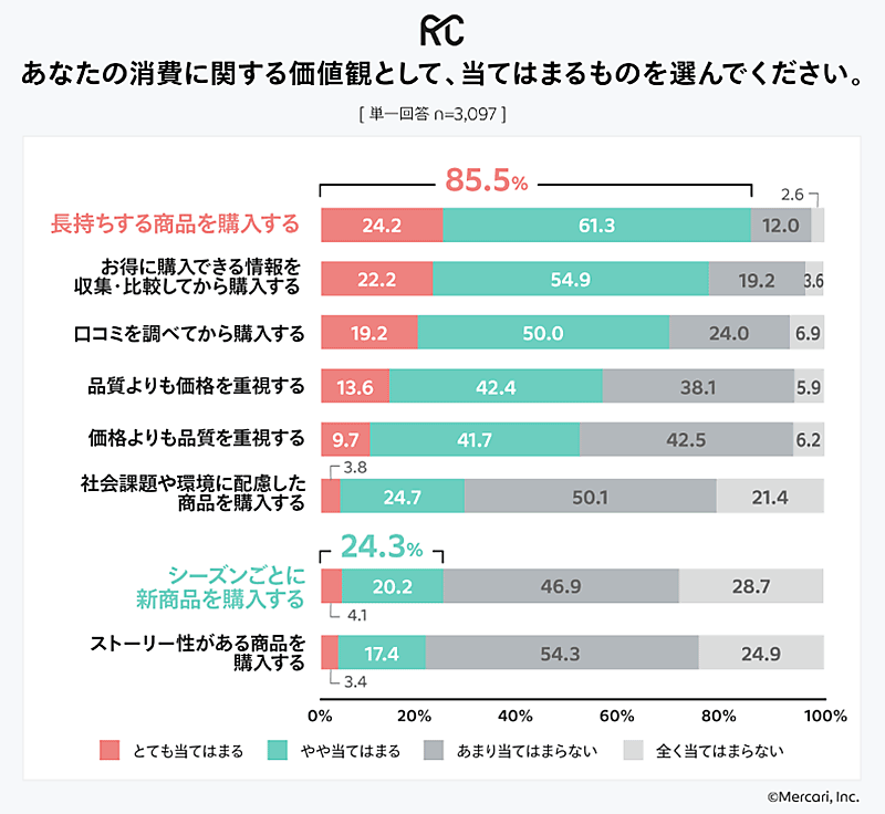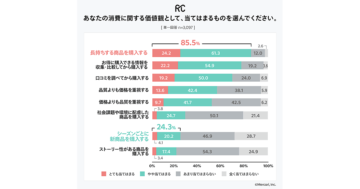 調査対象者に消費に関する価値観について聞いたところ、85.5%が「長持ちする商品を購入する」と答えた。「シーズンごとに新商品を購入する」と回答した人は24.3%だった。