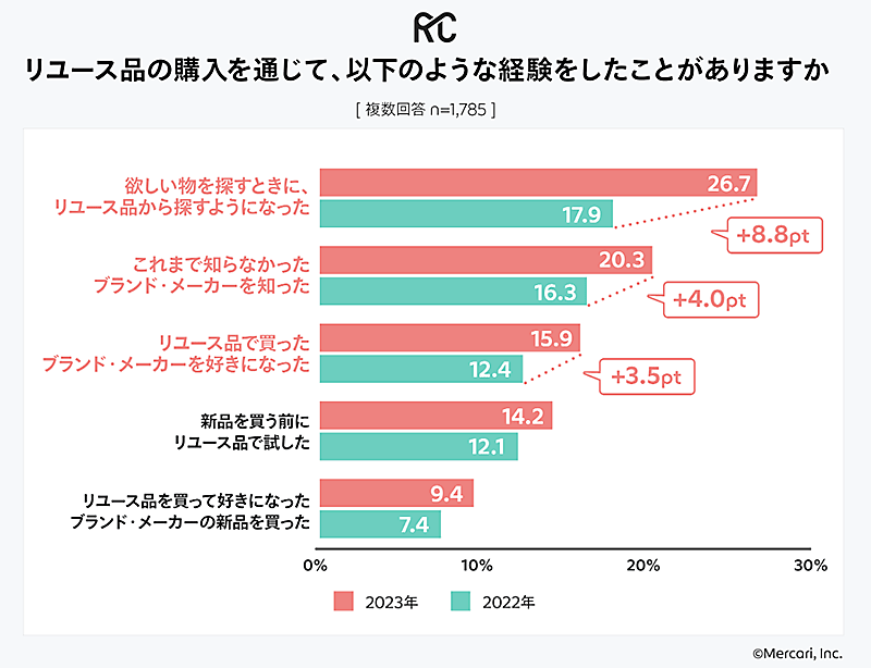 リユース品の購入を通じた経験について聞いたところ、「欲しい物を探すときに、リユース品から探すようになった」は26.7%で、2022年より8.8ポイント増加。「これまで知らなかったブランド・メーカーを知った」は20.3%で同4.0ポイント増、「リユース品で買ったブランド・メーカーを好きになった」は15.9%で同3.5ポイント増だった。