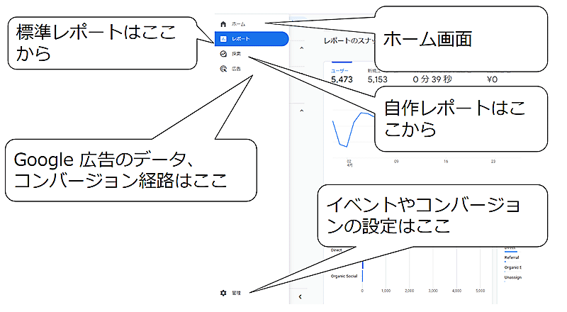 GA4の基本構成として、「ホーム画面」「レポート」「探索」「広告」「設定」があります。「レポート」では、標準レポートを見ることができます。「探索」は自作レポートの作成、「広告」はGoogle広告のデータ、コンバージョン経路を確認できます。また、左下の「設定」ではイベントやコンバージョンの設定が可能です。