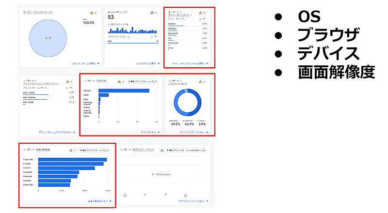 標準レポートは多くないので、できるだけすべて見た方が良いです。ただ、あえて優先順位を付けるとすれば、まずは「ユーザー>テクノロジー>概要」から確認できる、OSやブラウザ、デバイス、画面解像度などのユーザー環境がわかるレポートを見ることをお勧めします。