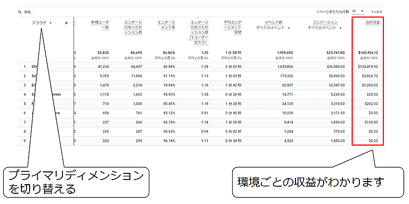 eコマースの設定をしておけば、合計収益というのがレポートで出るのですが、ブラウザ別にいくらくらい購入されたかがわかります。ここでは「プライマリディメンション」に切り替えても良いでしょう。