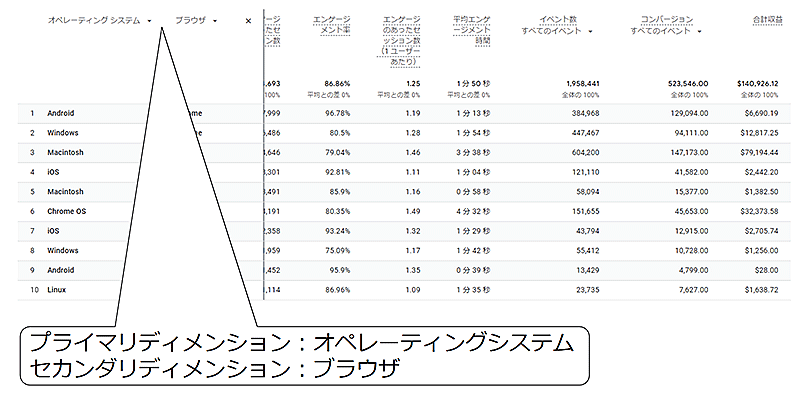上記のレポートのお勧めの設定は、プライマリディメンションを「オペレーティングシステム」に、セカンダリディメンションを「ブラウザ」にして、2つを掛け合わせてみるというものです。