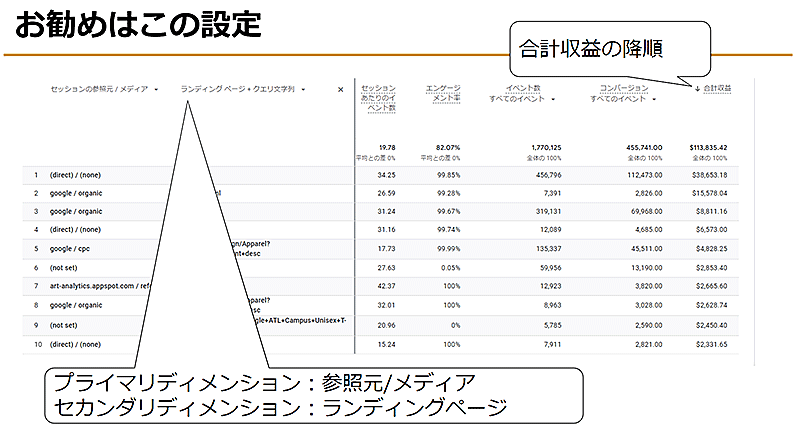 上記のレポートのお勧めの設定は、プライマリディメンションを「参照元/メディア」に、セカンダリディメンションを「ランディングページ+クエリ文字列」にするというものです。ユーザーがどこから来ているか、どのページから見始めたユーザーが購入しているかがわかります。