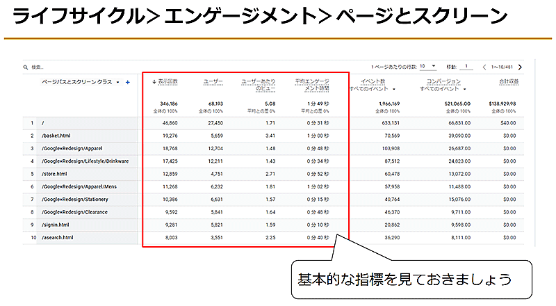 さらに「ライフサイクル>エンゲージメント>ページとスクリーン」のレポートから、基本的な指標を確認しておくことも大切です。