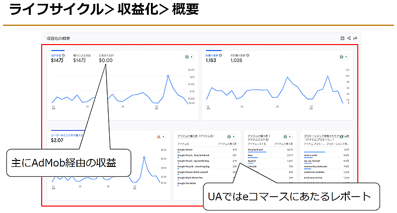 「ライフサイクル>収益化>概要」のレポートは、UAにおける「eコマース」にあたるもので、基本的な収益や購入数、顧客単価がわかります。なお、レポート内の「広告収入合計」というのは、AdMob経由の収益という意味です。